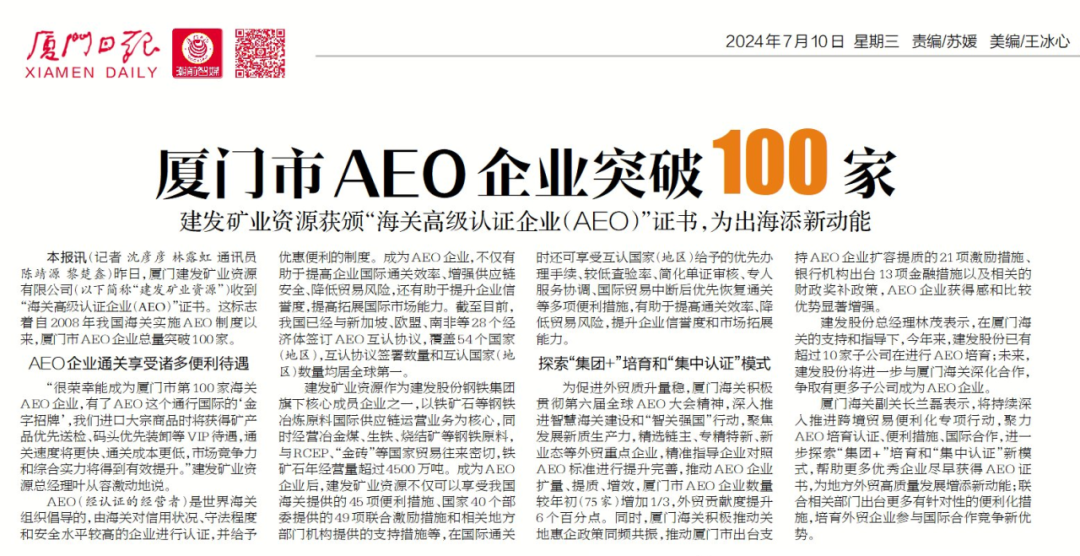 交融共贏開(kāi)新局丨建發(fā)礦業(yè)資源獲頒成為廈門(mén)市第100家AEO高級(jí)認(rèn)證企業(yè)