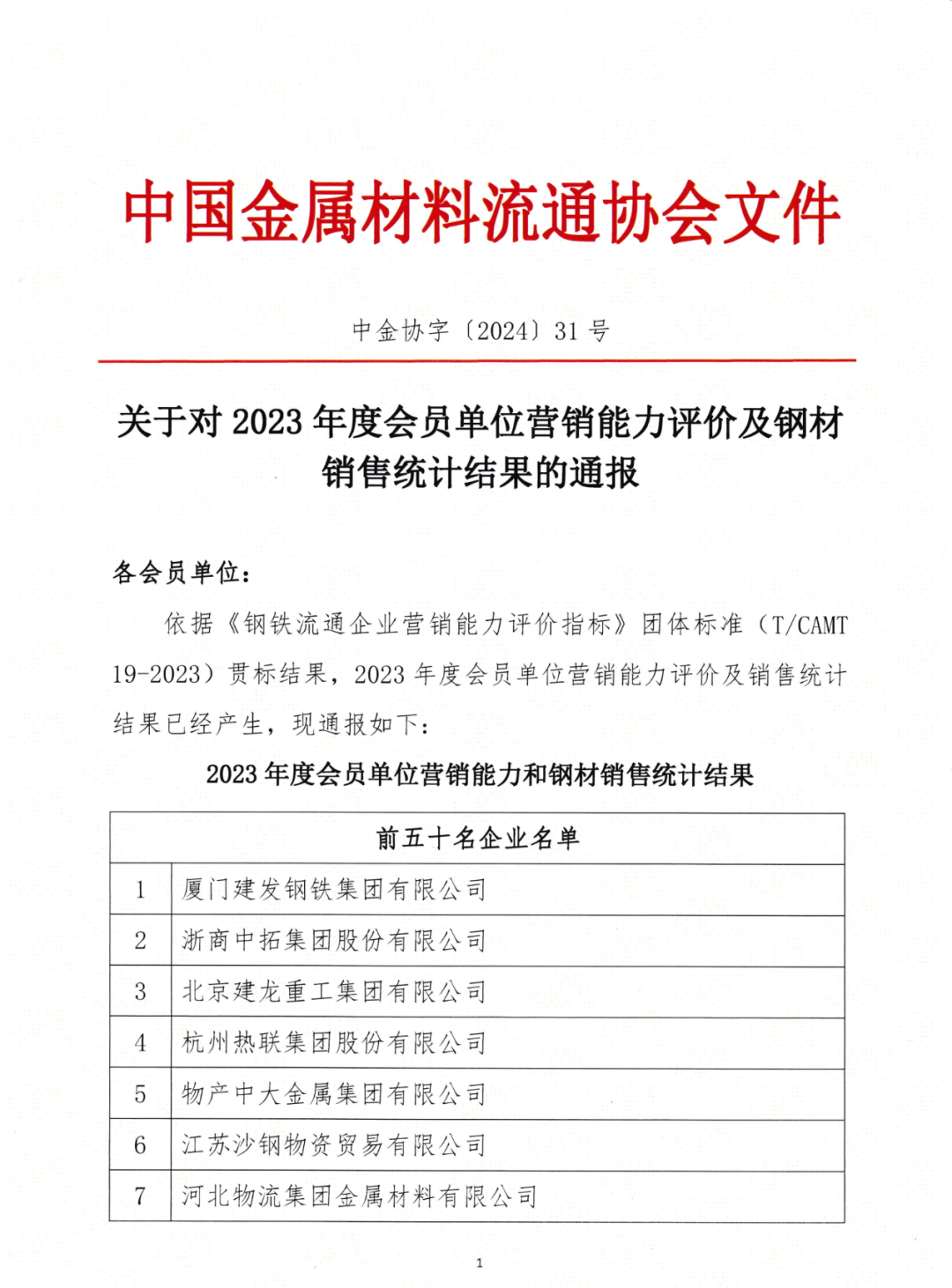 蟬聯(lián)第一 | 建發(fā)鋼鐵集團位列中金協(xié)2023年營銷能力評價及鋼材銷售統(tǒng)計結(jié)果第一位