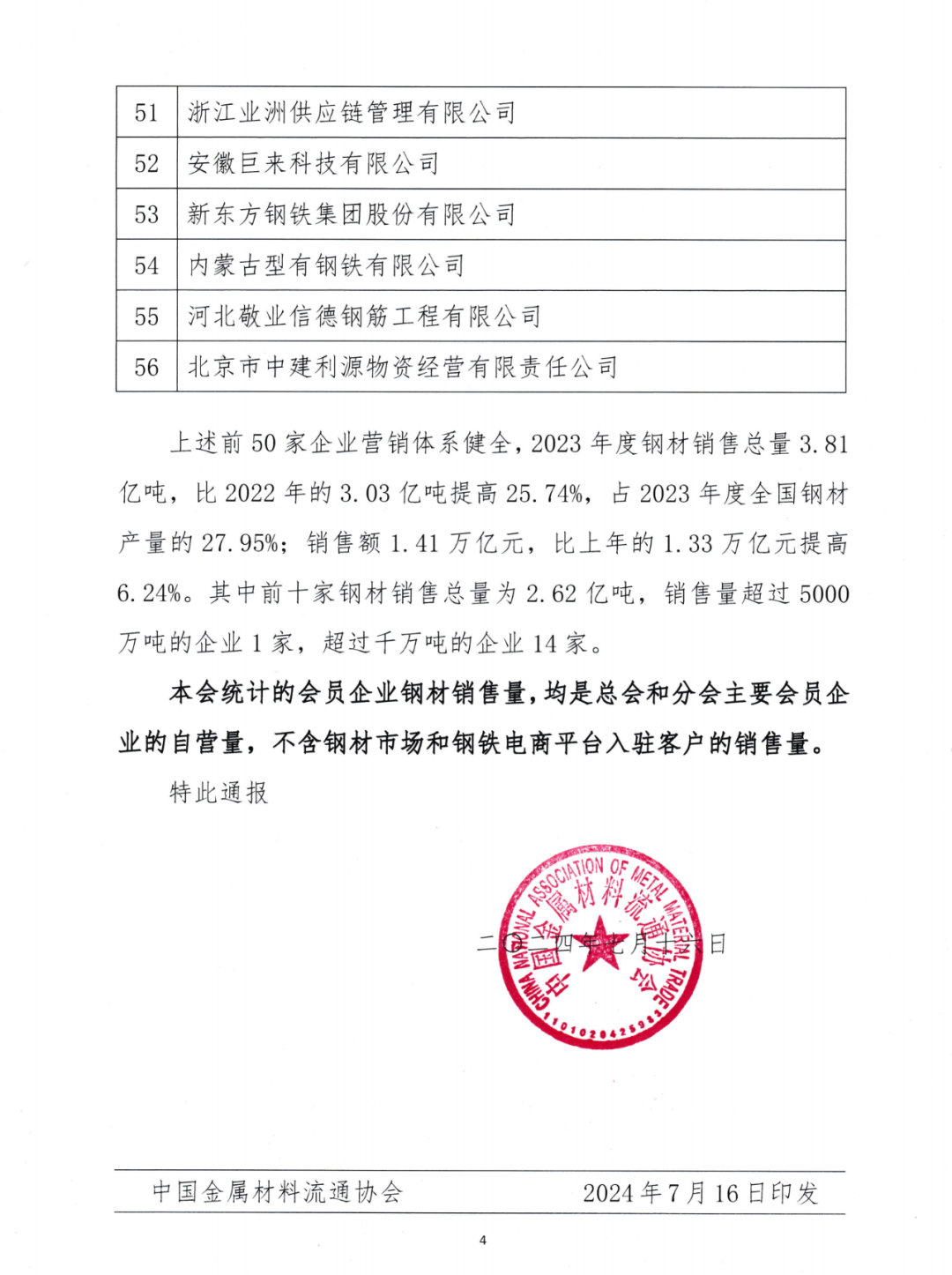 根據(jù)中國金屬材料流通協(xié)會的統(tǒng)計,本次評價結(jié)果前50名企業(yè)2023年度鋼材銷售總量 3.81億噸,占年度全國鋼材產(chǎn)量的 27.95%,銷售總額1.41萬億元,其中前十家鋼材銷售總量為2.62億噸。